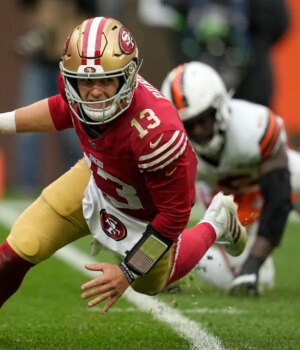 O quarterback Brock Purdy acertou 12 de 27 para 125 jardas, um touchdown e uma interceptação, mas foi capaz de mover o 49ers para a linha de 23 jardas do Cleveland com nove segundos para jogar antes de Jake Moody perder um field goal de 41 jardas.