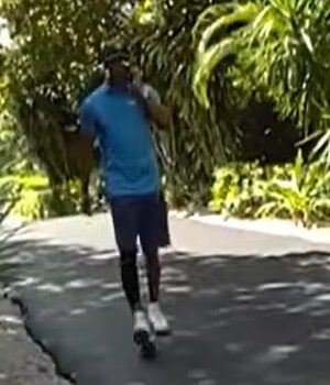 Ele está ajoelhado na grama enquanto é realizado um exame médico, e um policial pode ser ouvido perguntando: ‘Isso é confortável para você?’, ao que ele responde: ‘Sim, sim.’