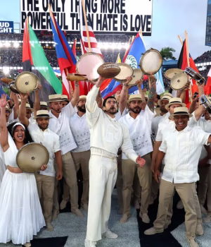 Um grupo de artistas saiu ao final da apresentação agitando as bandeiras de cada país da América do Norte, do Sul e da América Latina.