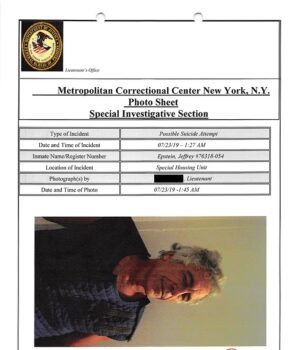 Juntamente com as fotografias, documentos do Centro Correcional Metropolitano de Nova Iorque, onde Epstein estava encarcerado, indicam uma “possível tentativa de suicídio” já em 23 de janeiro de 2019, conforme mostrado acima – seis meses antes de sua morte, em 10 de agosto de 2019.