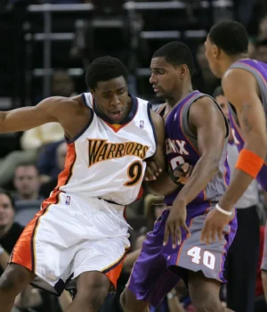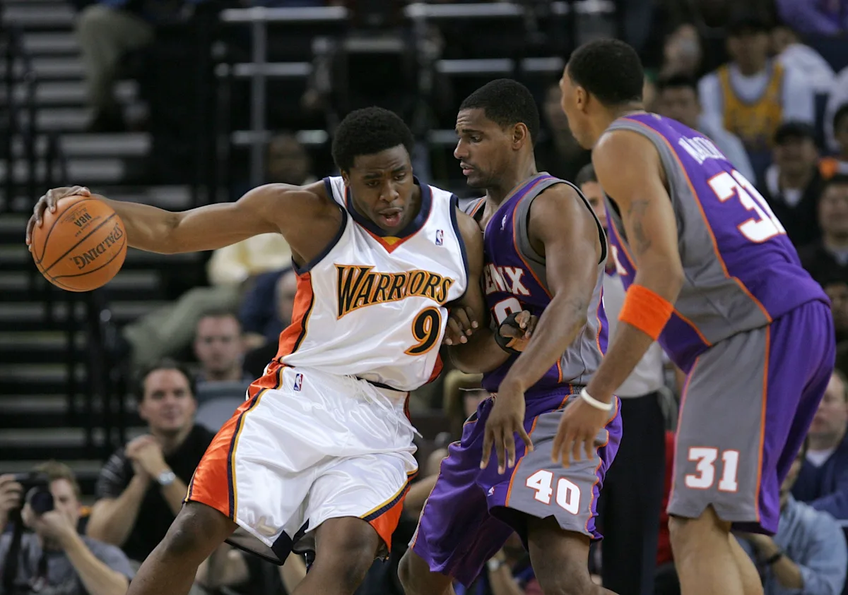 OAKLAND, CA – 07 DE DEZEMBRO: Ike Diogu nº 9 do Golden State Warriors passa a bola por Kurt Thomas nº 40 e Sean Marion nº 31 do Phoenix Suns em 7 de dezembro de 2005 na Arena em Oakland, Califórnia. Nota ao Usuário: O Usuário reconhece e concorda expressamente que, ao baixar ou usar esta fotografia, o Usuário concorda com os termos do Contrato de Licença da Getty Images. (Foto de Justin Sullivan/Getty Images)