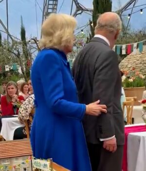 Um vídeo feito durante a visita do casal real ao Projeto Éden na terça-feira capturou Camilla, 77, conversando com um membro da equipe enquanto batia em Charles, 78, com dois dedos.