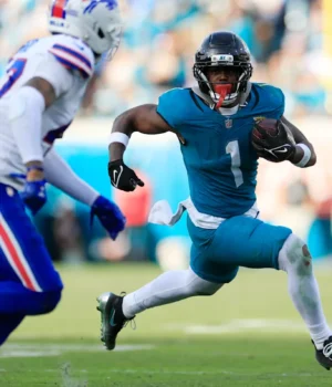 (1) corre por jardas contra o cornerback Christian Benford (47) do Buffalo Bills durante o quarto quarto de um jogo de playoff de wild card da NFL AFC, domingo, 11 de janeiro de 2026, em Jacksonville, Flórida. (Corey Perrin/Florida Times-Union)