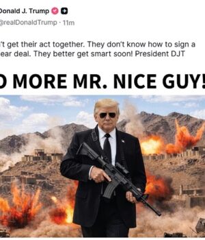 Em uma postagem bizarra no Truth Social, o presidente dos EUA compartilhou uma foto aparentemente gerada por IA cercada por explosões com a legenda: ‘Chega de Sr. Cara Bonzinho!’
