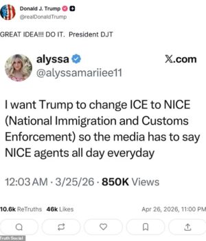 ‘Quero que Trump mude o ICE para NICE (National Immigration and Customs Enforcement), para que a mídia tenha que ligar para os agentes do NICE o dia todo’, postou Marie no X em março.