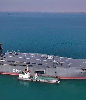 Uma cabine de comando de 180 metros foi posteriormente adicionada ao porta-aviões, retratada transportando UAVs, helicópteros e sistemas de defesa aérea de médio alcance.