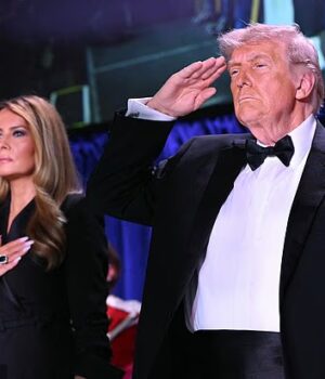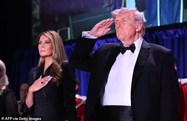 Trump e sua esposa Melania subiram ao palco depois de deixar a Casa Branca na noite de sábado, enquanto o resto dos participantes repletos de estrelas percorreram o tapete vermelho para ocupar seus lugares, junto com JD Vance e sua esposa Usha, bem como a secretária de imprensa Carolyn Levitt.