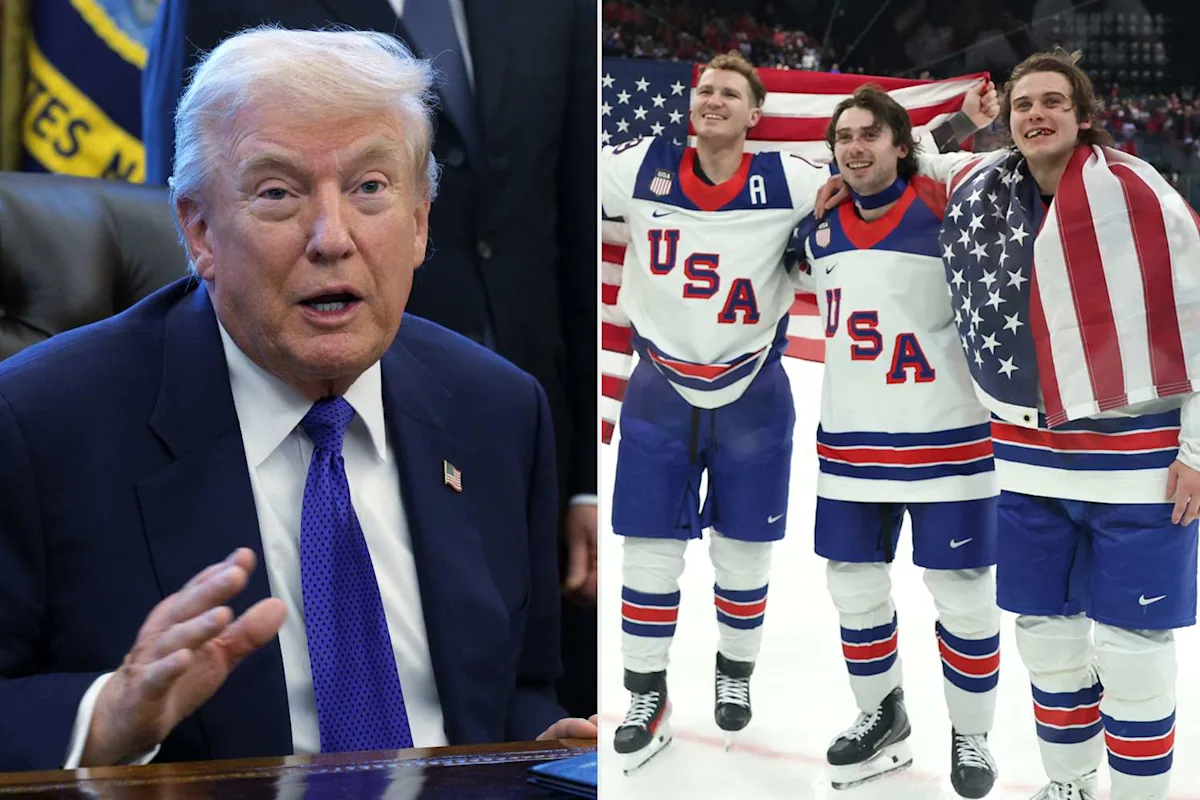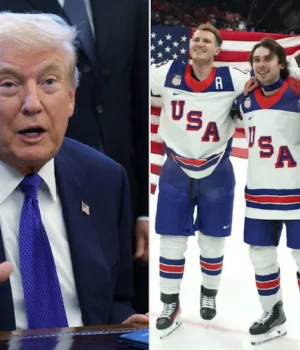 o presidente Donald Trump fez um telefonema de parabéns à seleção masculina de hóquei dos EUA após a vitória sobre o Canadá na disputa pela medalha de ouro olímpica no domingo, 22 de fevereiro.
