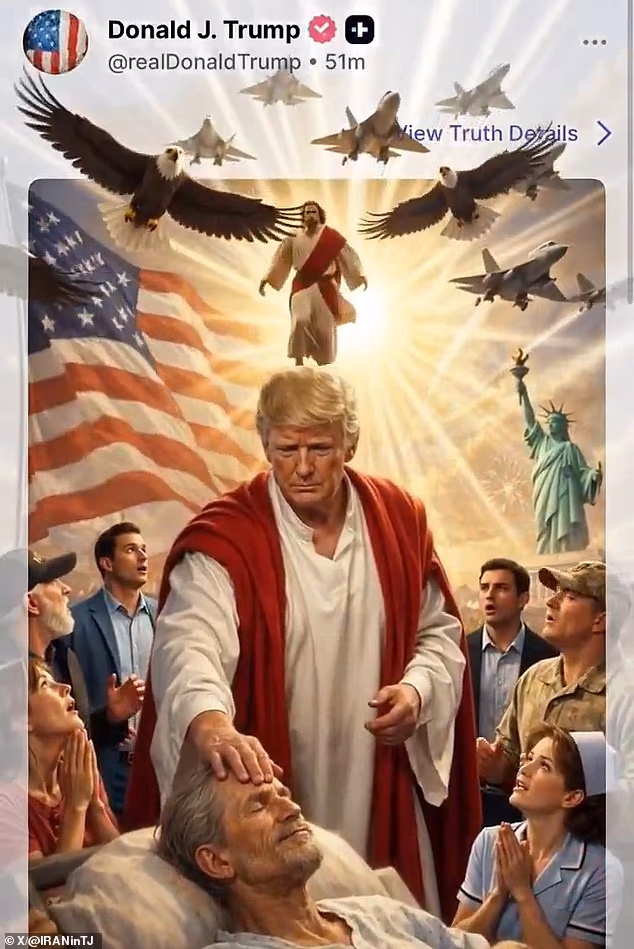 Na foto postada no Truth Social, Trump é visto vestido de vermelho e branco enquanto cura um homem com suas mãos curativas enquanto uma bandeira americana tremula ao fundo.