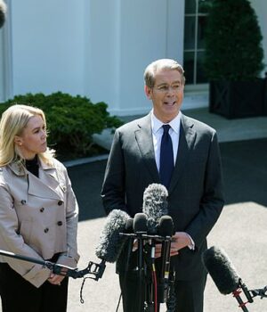 O secretário de imprensa da Casa Branca, Karolin Levit (à esquerda), e o secretário do Tesouro Scott Besent (direita) conversam com a mídia externa da Casa Branca