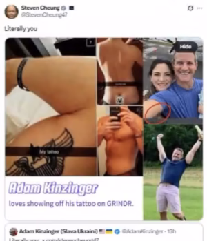 Cheung então levou as coisas a um nível totalmente novo ao postar uma foto de Kinzinger com sua esposa junto com outras imagens do corpo seminu de um homem. A imagem sugere que Kinzinger postou fotos escandalosas de si mesmo em um site de namoro gay.
