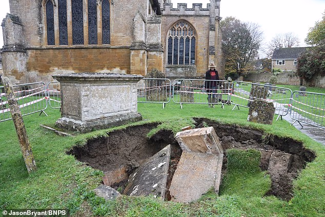 Espectadores perturbados lotam uma igreja depois que uma tumba desabou em um buraco, revelando uma cripta subterrânea de 300 anos.