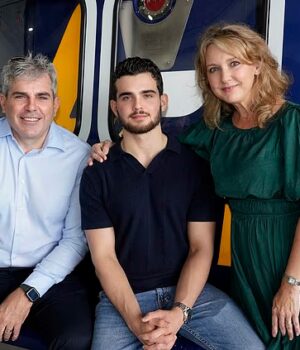 Jack McCollum (no centro da foto, com seus pais Tim e Rachel) sofreu uma fratura na coluna, costelas quebradas, hemorragia interna e um corte na cabeça após cair 80 metros durante uma caminhada