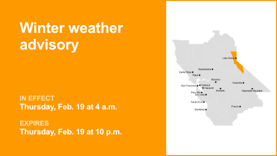 O Serviço Meteorológico Nacional emitiu um aviso meteorológico de inverno à 1h43 de terça-feira, que está em vigor das 4h às 10h de quinta-feira, 19 de fevereiro, para a área metropolitana do Lago Tahoe.