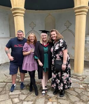 Ele disse: ‘Estamos muito magoados e com muita raiva. Agora luto com a sensação de que falhei com a minha família por não os julgar”. Na foto: Jade, à esquerda, com Paul, no centro, e Lisa, à direita, no dia do casamento do casal