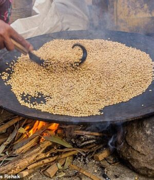 Acima é mostrado a torrefação de grãos teff na Etiópia. Eles serão transformados em pão injera, um alimento básico da Etiópia que é um pão achatado e de textura leve.