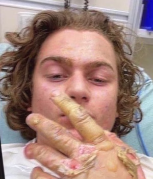 O incendiário acusado Stephen Pittman, 19, mostrou suas queimaduras em seu quarto de hospital
