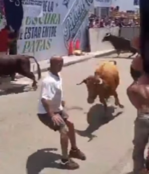 O homem foi derrubado pelo golpe e, momentos depois, outro touro avançou com a cabeça e perdeu.