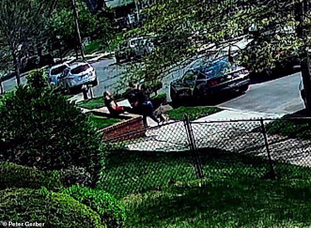 O ataque aconteceu pouco depois das 11h, quando imagens de vigilância mostram uma mulher de 39 anos e seu namorado de 39 anos passeando com o cachorro, que urinaram na grama do suspeito.
