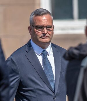 PC Mark Burrows, 46, retratado fora do tribunal, foi ‘cegado’ pela ‘névoa vermelha’ durante uma perseguição em alta velocidade e bateu no carro da mãe de três filhos, ferindo-a mortalmente, disse um júri.