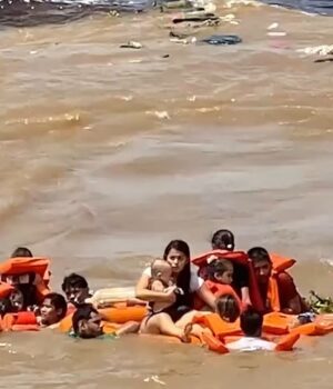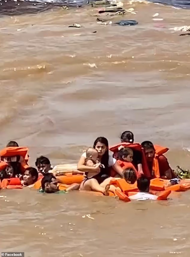 Imagens horríveis mostram mulheres, crianças e homens com coletes salva-vidas flutuando na água