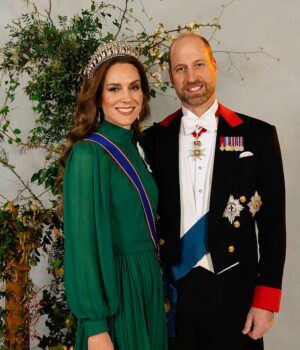 A princesa Catherine parecia incrivelmente majestosa em um vestido de noite verde esvoaçante enquanto mostrava aos convidados o melhor da hospitalidade britânica, sorrindo calorosamente ao sentar-se entre o presidente e outro membro de sua comitiva.