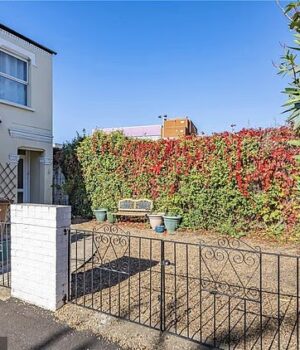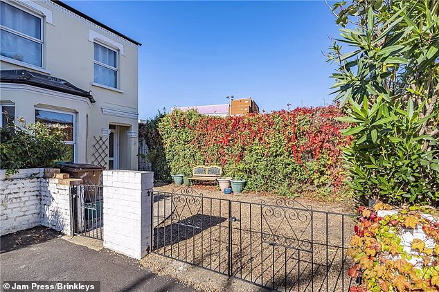 Listado pelo vendedor como um preço “razoável”, a propriedade fica em um jardim fechado com uma cerca viva e um banco de um lado e a lixeira do proprietário do outro.
