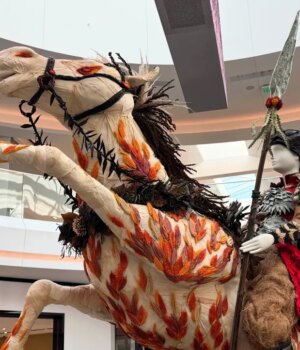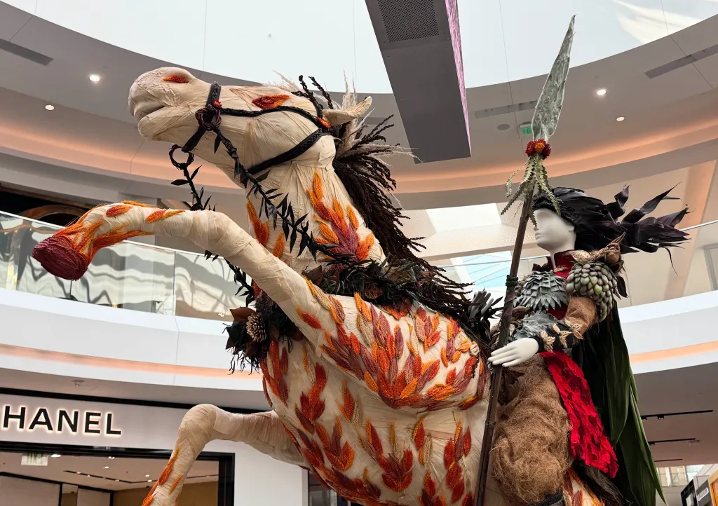 No centro da exposição está um impressionante monumento ao Ano do Cavalo, criado pela equipe Bloomstar liderada pelo proprietário e designer-chefe Crane Rasmussen. O cavalo de fogo é montado por uma guerreira, vestida com uma armadura de escamas feita de suculentas em camadas. O corpo do cavalo é coberto por palha de milho, as chamas são feitas de talos de trigo coloridos e as botas escuras do cavaleiro são cobertas por sementes de chia.