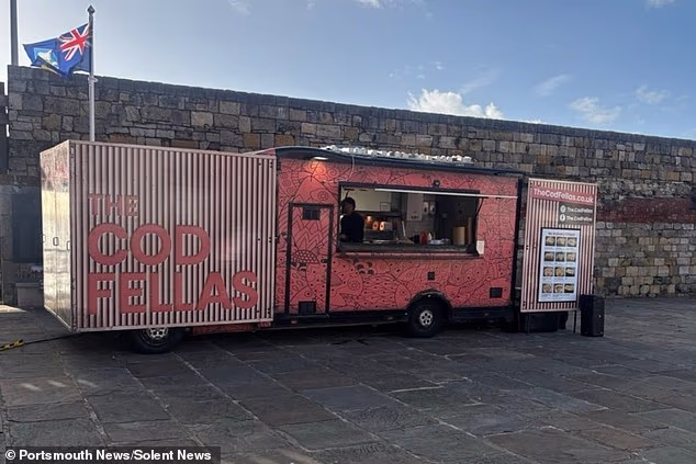 O caminhão de catering Cod Fellas instalou-se na terça-feira (foto) em frente ao monumento em Portsmouth, Hampshire, em homenagem aos que morreram no conflito de 1982.