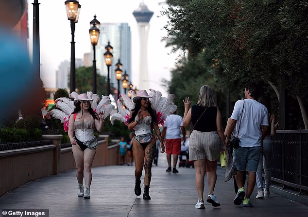 Las Vegas recebeu 1,6 milhão de passageiros visitando em agosto, o que representou uma queda percentual em comparação com o mesmo período do ano passado. Las Vegas Strip caminhando para visitantes para visitantes mulheres vestidas como Shogarls Wave