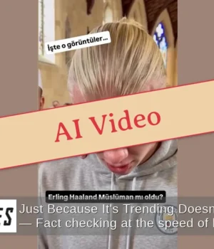 O vídeo do jogador de futebol do Manchester City, Erling Haaland, recitando a Shahada, a declaração de fé islâmica e se convertendo ao Islã, é real? Não, isso não é verdade: uma ferramenta online de detecção de vídeo por IA determinou que o clipe tinha 100% “provabilidade de ser gerado por IA”. Uma ferramenta separada descobriu que o vídeo mostrava sinais de ter sido criado ou modificado usando ferramentas ou técnicas de IA.