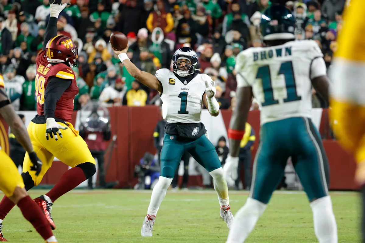 20 de dezembro de 2025; Landover, Maryland, EUA; O wide receiver do Philadelphia Eagles, AJ Brown (11), passa a bola pelo cornerback do Washington Commanders, Jonathan Jones (31), durante o primeiro tempo no Northwest Stadium. Crédito obrigatório: Amber Searls-Imagn Images