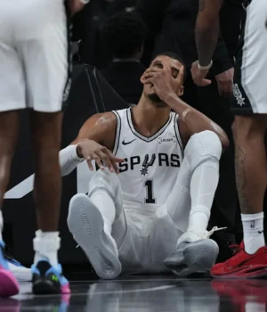 Wembanyama ficou na quadra por cerca de 30 segundos antes de se sentar por cerca de um minuto e conversar com seu companheiro de equipe Stephen Castle. O técnico do San Antonio, Mitch Johnson, pediu um tempo limite para verificar Wembanyama, que correu pelo túnel assim que se levantou.