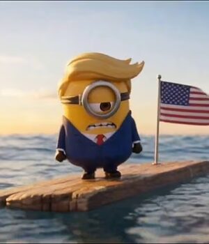 O vídeo começa com uma versão cartoon de Trump flutuando em uma prancha de madeira ao lado de uma bandeira americana.