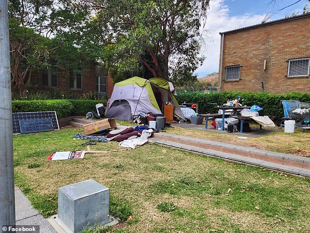 O vídeo mostra um homem vomitando em plena luz do dia dentro de um acampamento de moradores de rua em Cessnock Park enquanto os transeuntes passam o dia.