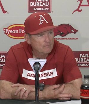 A conferência de imprensa do técnico do Arakansas Basbol, Dave Van Horn, na conferência de imprensa do Postgem, no estádio Bom-Walker de Fayetville na sexta-feira, depois de dividir o duplo contra o Texas A&M na sexta-feira.