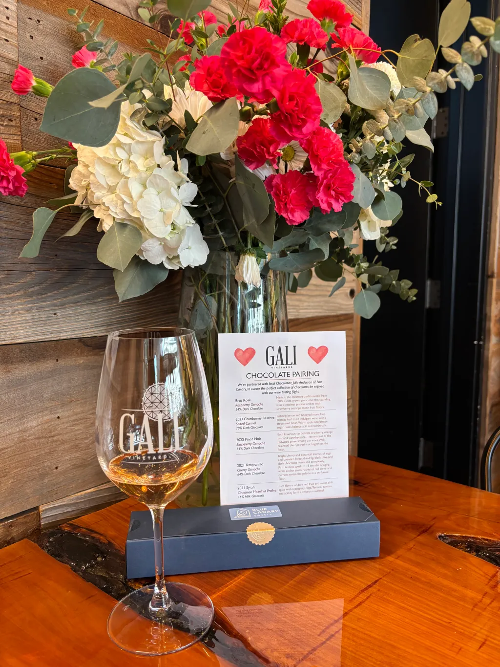 2023 Gali Vineyard Brut Rosé, US $ 40 – Esta deliciosa tigela de frutas vermelhas feita com pinot noir cultivado no vinhedo Gali Estate de Watsonville é combinada com uma trufa de ganache de framboesa feita pela chocolatier Blue Canary Sweets Julia Anderson como parte dos sabores sazonais do Five G Winali. Anderson, que já foi dono da Fleur de Coco em Los Gatos, criou uma caixa com cinco chocolates para a dupla, que fica disponível até o final de fevereiro ou enquanto os chocolates acabarem.