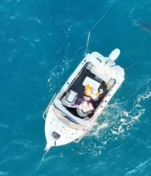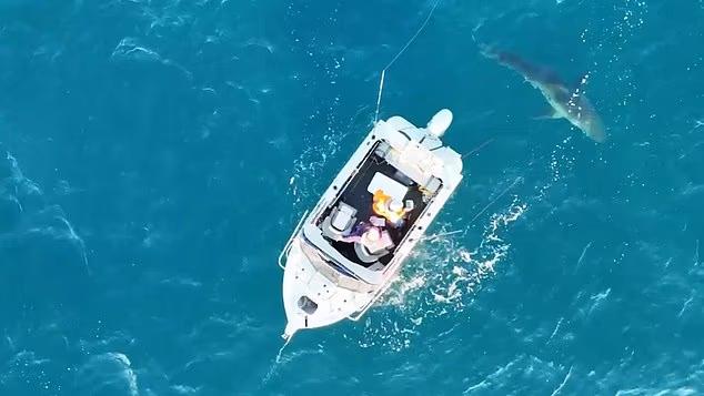 Quatro metros de pescadores foram ordenados por um grande tubarão branco enquanto pescavam em um barco de dois pescadores em imagens de terror de drone.