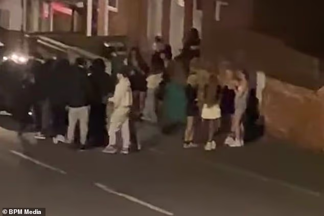 Imagens capturadas por um vizinho mostram um grande grupo do lado de fora da propriedade, confrontando um homem que está hospedado em outro quarto.