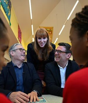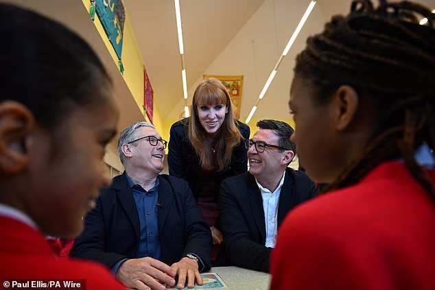 A primeira-ministra, Angela Rayner e Andy Burnham sorriram para as câmeras ao visitarem uma escola na Grande Manchester menos de um mês antes das eleições locais.