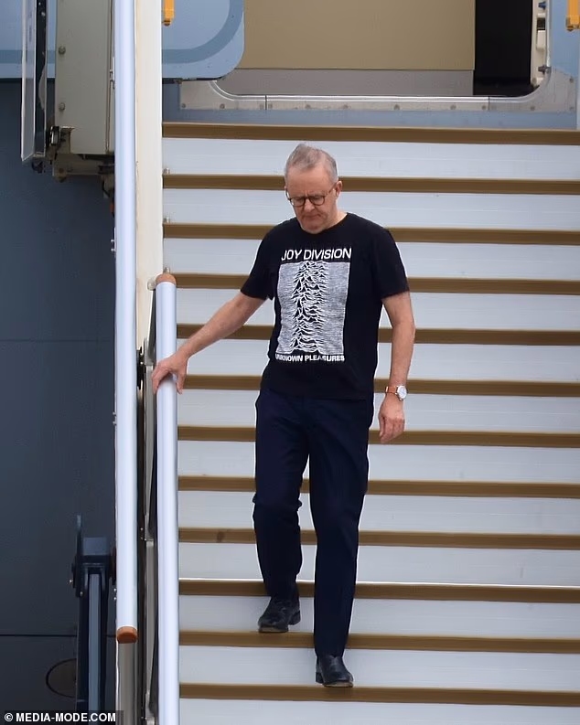 O primeiro-ministro Anthony Albanese está enfrentando reação negativa depois de ser expulso de um avião vindo de Washington vestindo uma camiseta do Joy Division – um movimento que a líder da oposição, Susan Ley, rotulou de “profundo fracasso de liderança”.