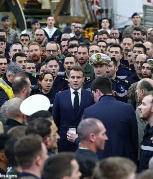 Emmanuel Macron insiste que Chipre “pode contar com a França” enquanto esfrega sal nas feridas do constrangimento militar britânico. Ele é retratado no porta-aviões francês no Mediterrâneo