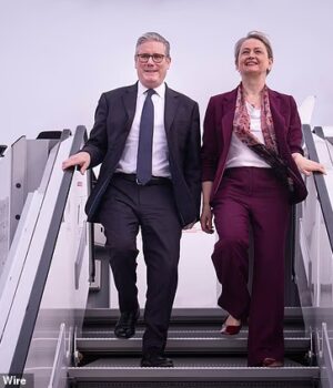 O primeiro-ministro Sir Keir Starmer e a secretária de Relações Exteriores Yvette Cooper chegam ao aeroporto de Munique, na Alemanha, antes da Conferência de Segurança de Munique