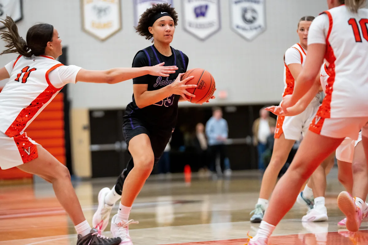 Jalia Kinetz (23) de Johnston leva a bola para dentro da pintura em 6 de fevereiro de 2026 na Valley High School.