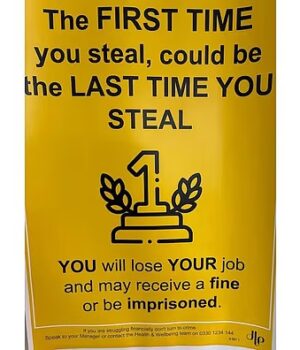 O cartaz dizia: ‘Roube a primeira vez pode ser a última. Você pode perder o emprego e ser multado ou preso.