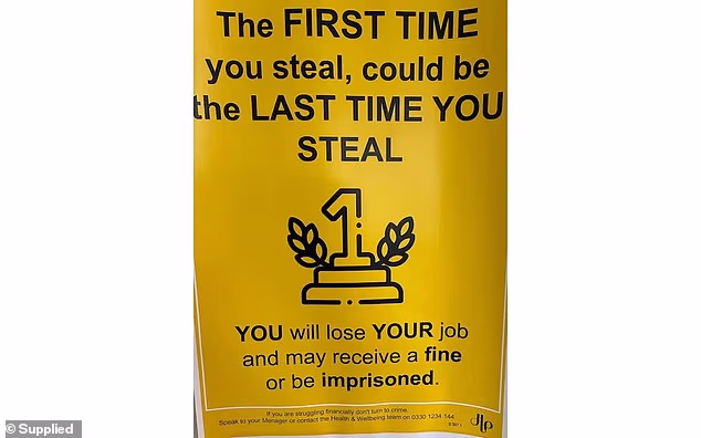 Waitrose tem cartazes anti-roubo nas áreas dos funcionários alertando os funcionários que eles podem perder seus empregos ou enfrentar a prisão se forem pegos roubando.